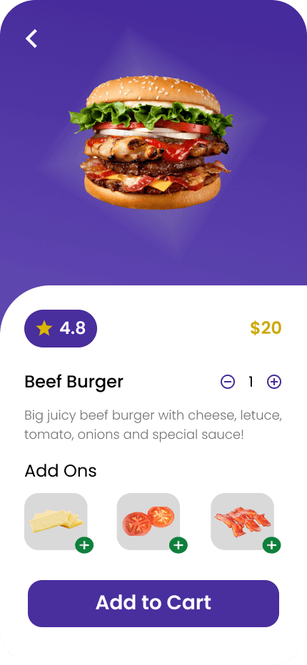 The screen is divided into two main parts: half of the screen is occupied by an image of a large burger, and the other half is an area with detailed descriptions and settings.
