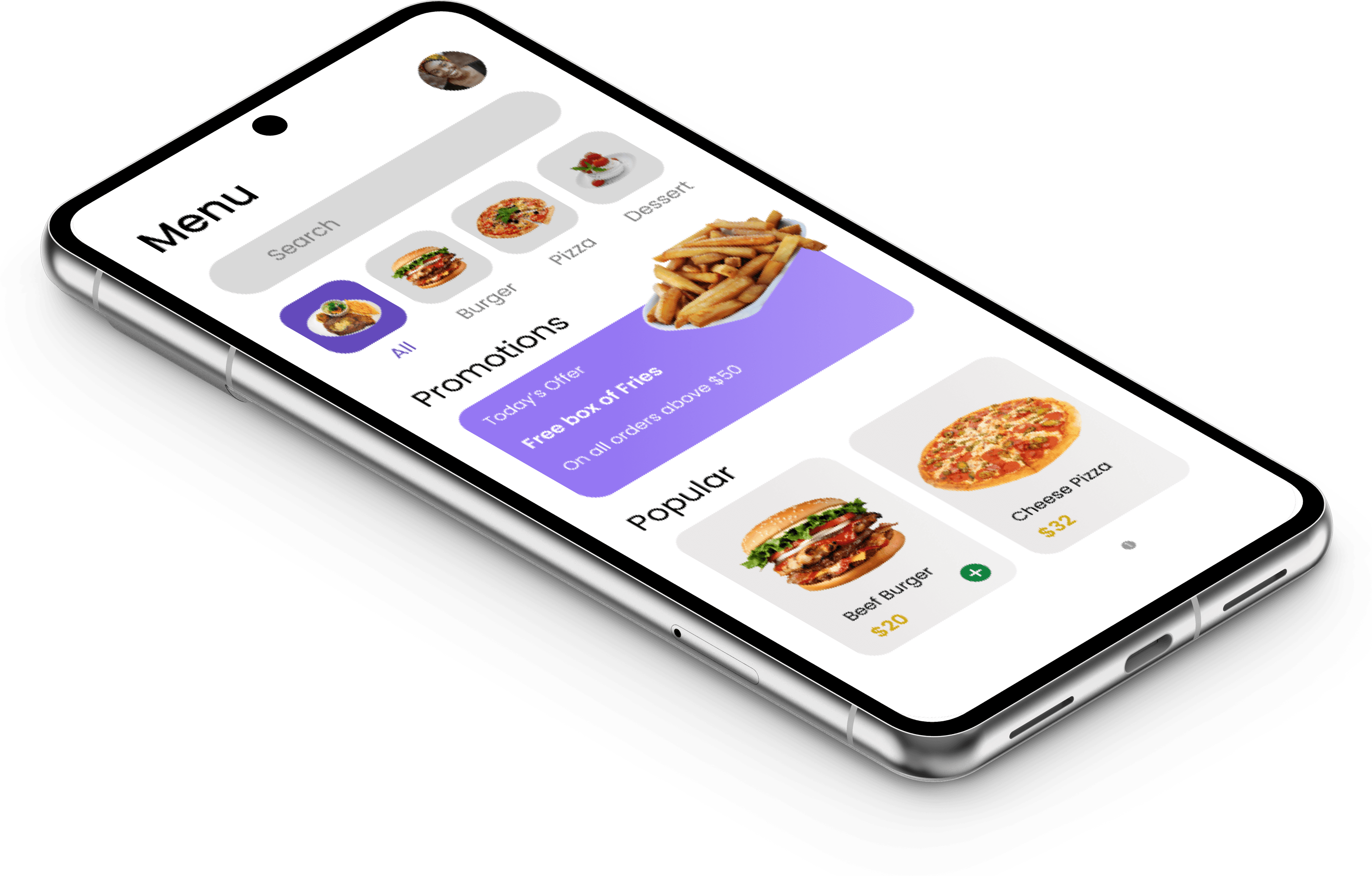 This screen is divided into clear sections with bold headings, making it easy for users to navigate. At the top of the screen is a menu header, followed by a search bar, category menu, promotions section, and finally a popular food section, making it easy to find food.